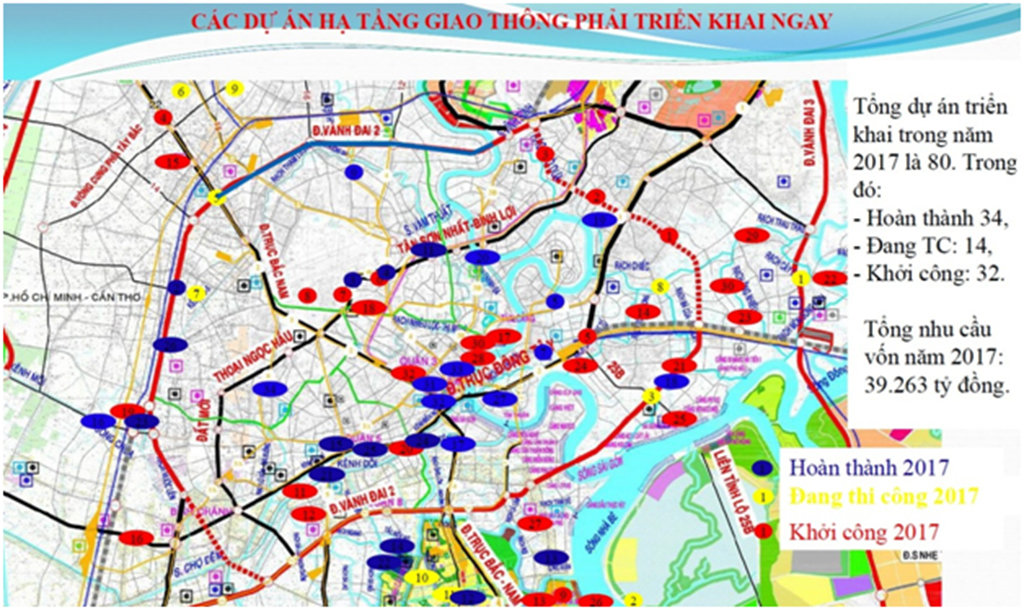 Theo Sở GTVT TP.HCM, trong năm 2017 sẽ triển khai 80 dự án xây dựng công trình giao thông với tổng vốn đầu tư 39.263 tỉ đồng. Đến nay, TP đã xác định được nguồn vốn đầu tư các dự án trên.